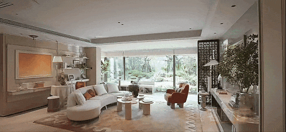 结合局部弧形玻璃与超大窗墙比,真正实现了“引景入室”,让家变成公园的观景台,重新定义了居住的视野界限。