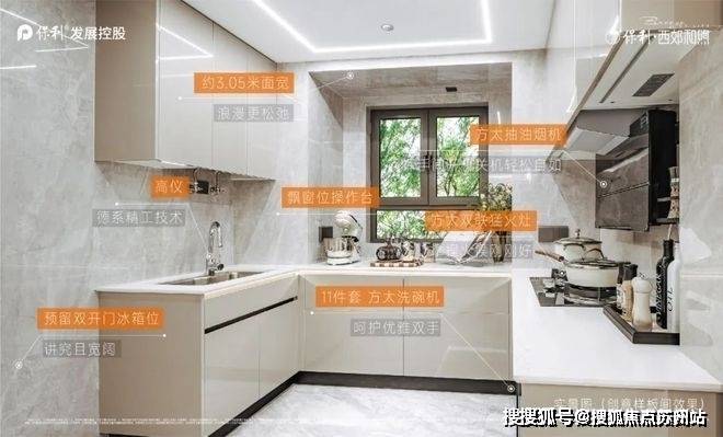保利西郊和煦售楼处电话: 400-8787-554U型厨房带飘窗的设计,左侧预留了双开门冰箱位置,让整个空间的利用率更高。