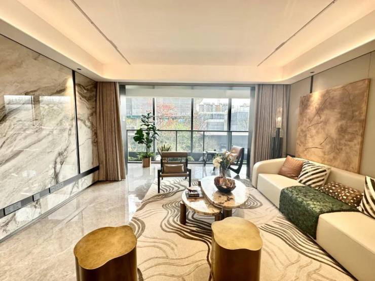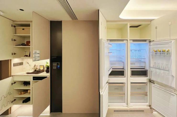 厨电配置 方太的顶配系列:上方送风下方吸油烟的空调油烟机、灶蒸烤一体机; 客厅配置 内嵌式卡萨帝双拼冰箱; 客厅 大理石岩板电视背景墙面、弧形吊顶 均为交付标准;