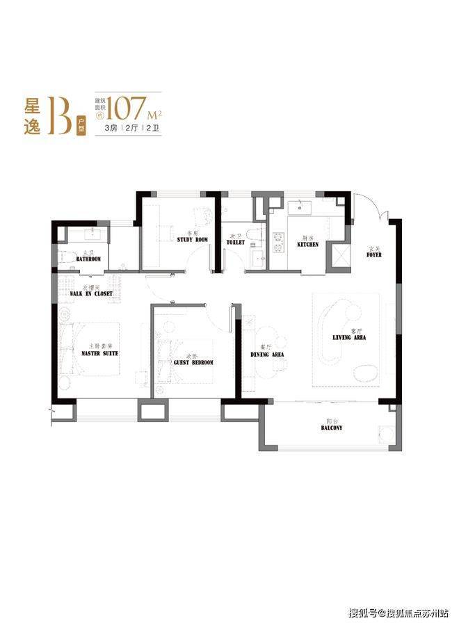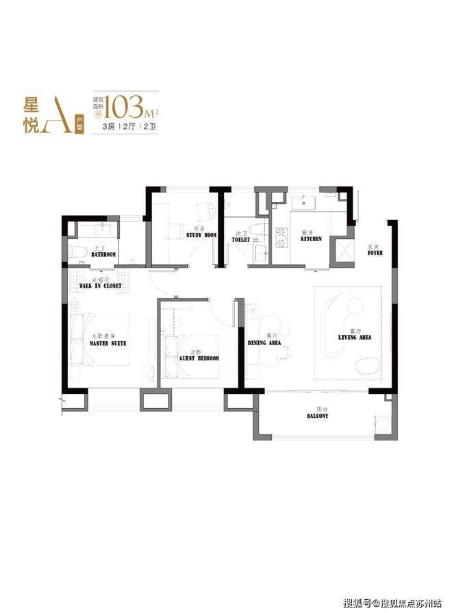 项目约103-107㎡3房2卫设计,有着宽绰的大横厅设计,并且3.5开间朝南。
