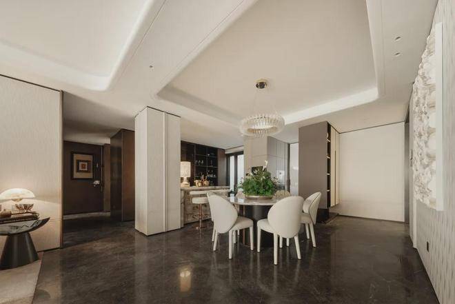 厨房与餐厅打造半开放式格局,隐形推拉门既可以隔绝烟火,平时收入墙内让空间一体、开阔大气。