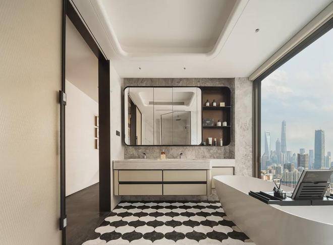 主卧套房中,非遗云纹立体墙布嵌入皮革背景,顶级爵士白奢材,艺术玻璃夹丝柜门,书香门第实木地板以回形纹路延伸雅致。主卫空间以鱼肚灰大理石与博雅白台面精工对拼,防水防潮皮革,香奈儿灰与星耀灰石材拼花地面,升级独立浴缸与尺度双台盆,营造艺术馆般的奢享境界。