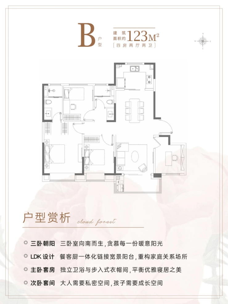 在当下100㎡及以下面积段占绝大多数的情况下,建面约123㎡4房本就十分稀缺。而在产品设计上更加符合全龄段各种家庭结构的居住需求。