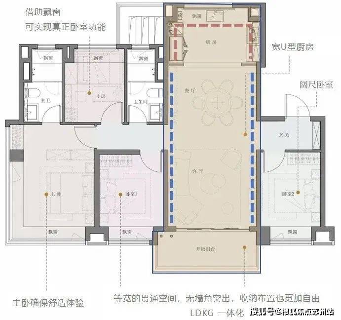 整个户型外延一圈被飘窗和阳台包裹起来。