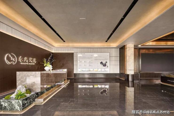 前台的设计,背景墙以山水画为引,通过精炼而抽象的手法,描摹出水面粼粼波光,画中梅影横斜,暗香浮动,充盈着江南水乡的秀丽柔情。