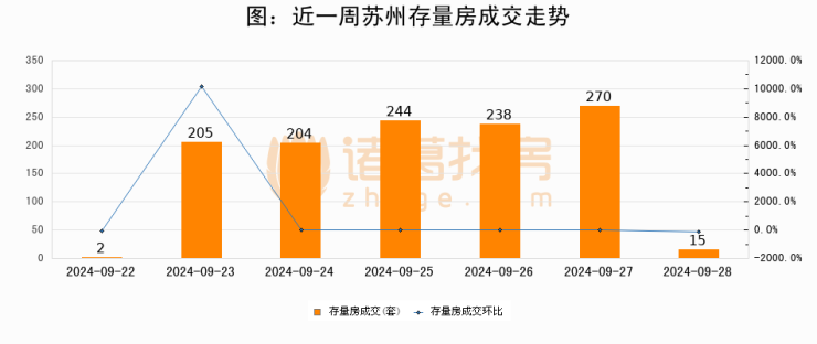 从存量房来看,2024年09月28日苏州存量房单日成交15套,比昨日减少255套,环比下降94.4%。从近一周存量房成交来看,苏州存量房日均成交套数为168套,09月28日单日成交15套,低于近一周平均水平91.1%。