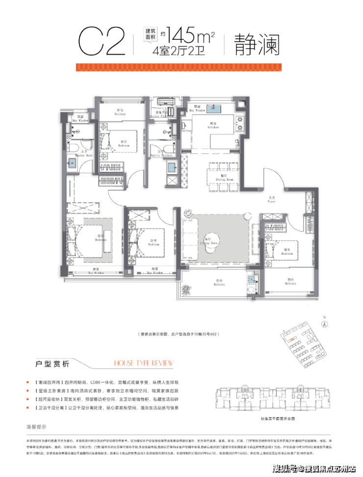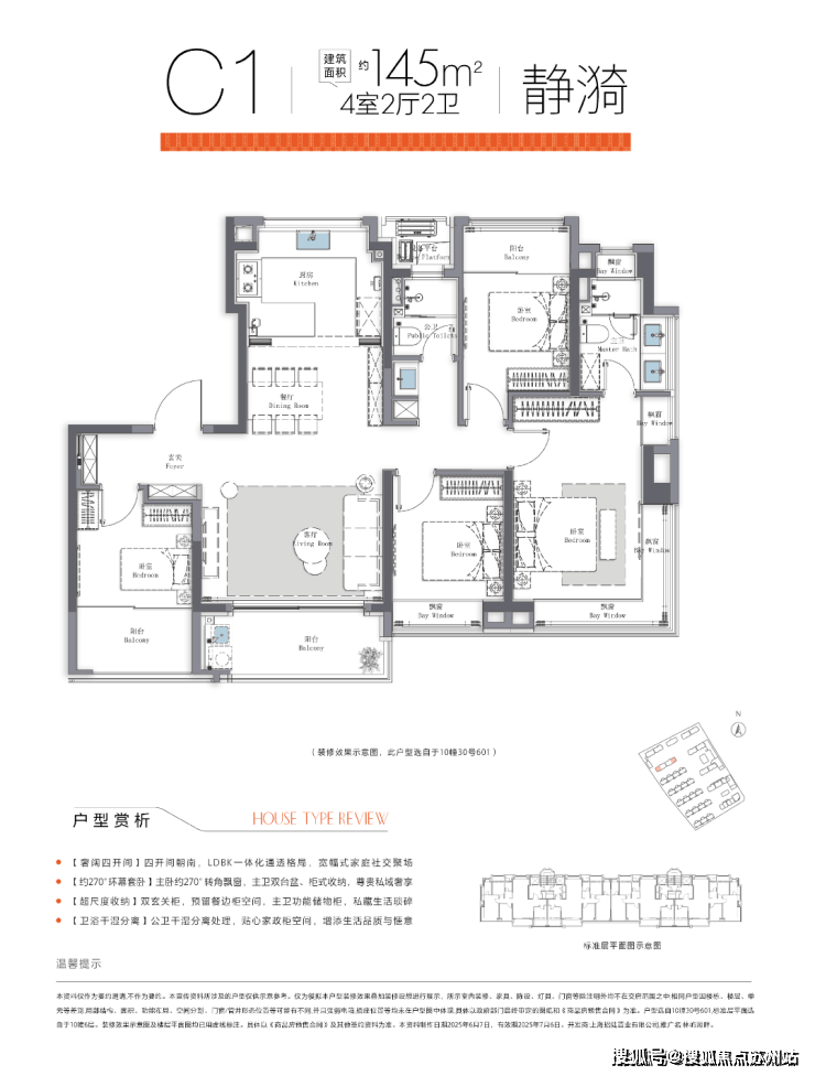 独立入户,横厅户型,同样为三开间朝南,南北通透,且厨房附赠飘窗,除客厅外,北房间也带阳台,边套户型主卧为270°飘窗!建面约145㎡4房2厅2卫,全两梯两户无连廊,共计约98套;
