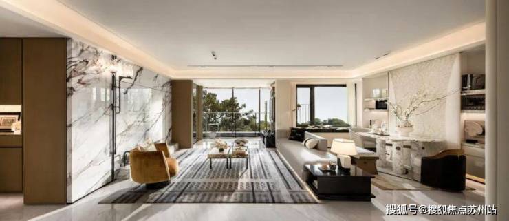 项目大量使用奢石设计,客厅 四边弧形天花、主卧 树叶拼花地板、精致优雅的 骨骼线设计,都是开发商花费更大成本和耗材去呈现更美的视觉体验。