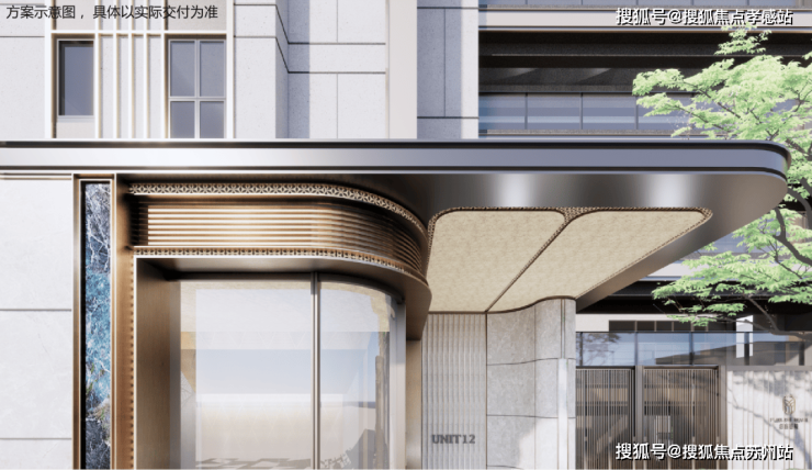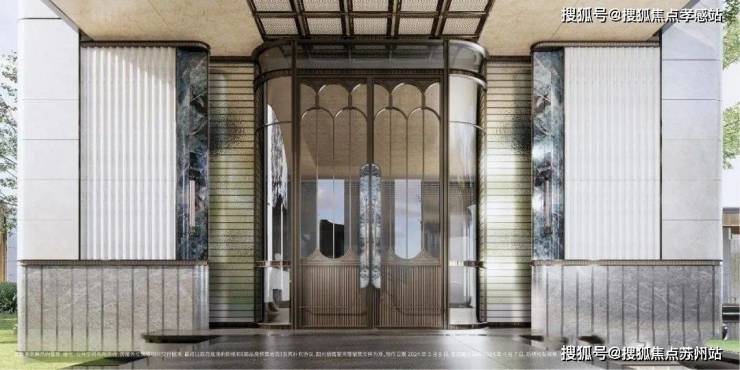 在楼栋主入口同样运用 石材+弧形铝板等元素,同时还有格栅装饰,质感提升明显: