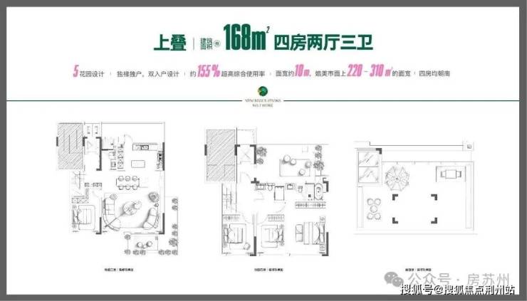 两款户型,建面约168/188㎡,均是独梯独户+双入户设计+约10米大面宽+约155%得房率的神户型!其中上叠更是实现了5花园设计!