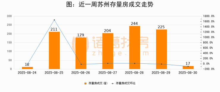从存量房来看,2025年08月30日苏州存量房单日成交17套,比昨日减少208套,环比下降92.4%。从近一周存量房成交来看,苏州存量房日均成交套数为156套,08月30日单日成交17套,低于近一周平均水平89.1%。