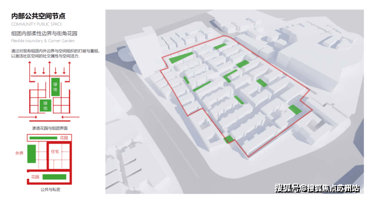庭院位于关键节点的交汇处,增加空间层次,界定组团边界;
