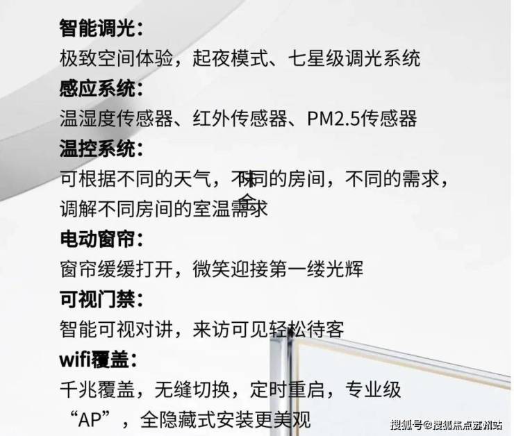 德国摩根·用科技创变生活智能调光:极致空间体验,起夜模式、七星级调光系统感应系统:温湿度传感器、红外传感器、PM2.5传感器温控系统:可根据不同的天气,不同的房间,不同的需求调解不同房间的室温需求电动窗帘:窗帘缓缓打开,微笑迎接第一缕光辉可视门禁:智能可视对讲,来访可见轻松待客wifi覆盖:千兆覆盖,无缝切换,定时重启,专业级“AP”,全隐藏式安装更美观
