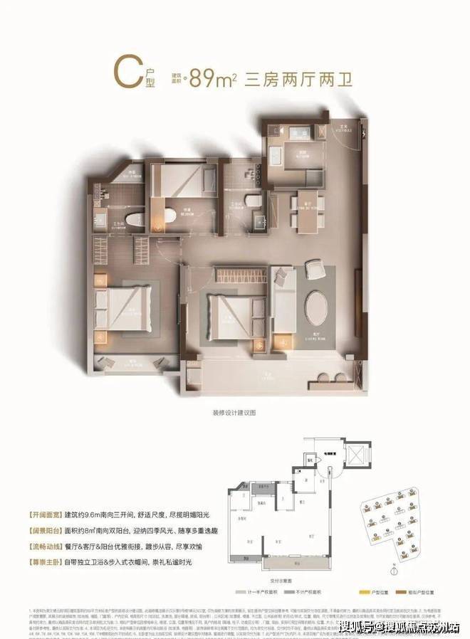 主力产品为建筑面积约89㎡户型,三房两厅两卫格局,南向三开间带宽幕双阳台,轻松容纳三口之家的温情与欢乐;建筑面积约110㎡均为边套户型,纵享丰富观景视野,四房两厅两卫设计并蓄尺度感与尊崇感。