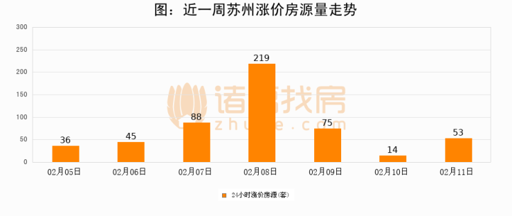 根据诸葛找房数据显示,苏州24小时涨价房源量为53套,较02月10日增加39套,环比上涨278.6%。与此同时,涨价房源占比小幅扩大,业主信心有所提升。