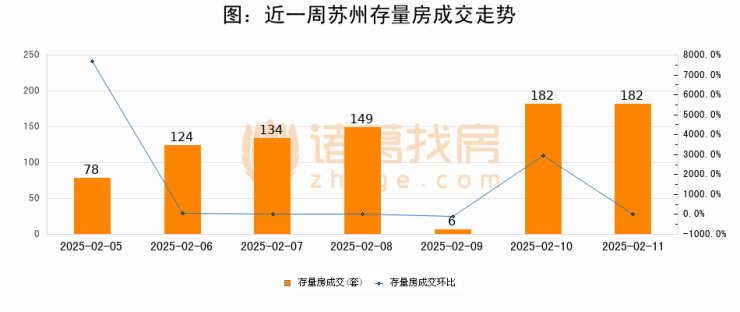 从存量房来看,2025年02月11日苏州存量房单日成交182套,比昨日持平。。从近一周存量房成交来看,苏州存量房日均成交套数为122套,02月11日单日成交182套,高于近一周平均水平49.2%。