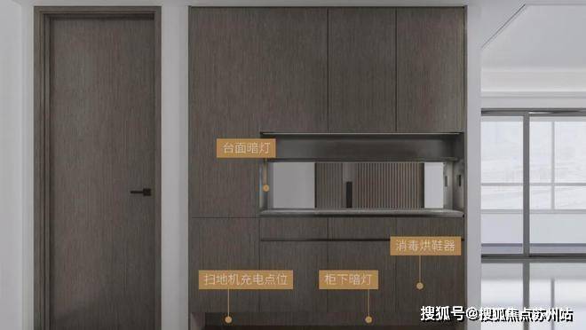 台面暗灯、柜下暗灯、入户感应、一键断电、消毒烘鞋器、扫地机充电点位6大设计,让居者出行更方便。