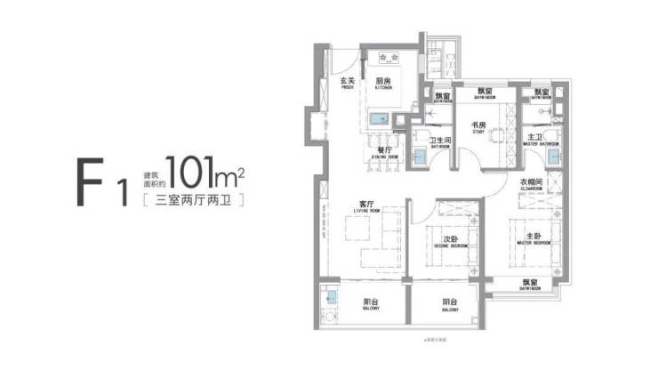 尤为重要的是,在百平方米的空间中,该户型竟做到了“南向双阳台+南北四飘窗”的设计,从居住舒适度与空间利用率出发,双阳台巧妙实现“景观阳台+生活阳台”的功能分区,不仅为室内引入充沛阳光,更提供了广阔的景观视野和多元化的生活场景;另一方面,从主卧、书房、两个卫生间都带有飘窗,增加空间利用率的同时,还能大幅扩充空间的收纳性。