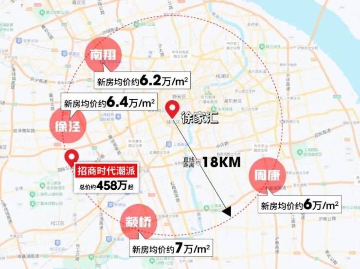 如果以徐家汇副中心为圆点,「招商·时代潮派」虽然与青浦徐泾、嘉定南翔等纬度相同,但是均价却有明显差距。