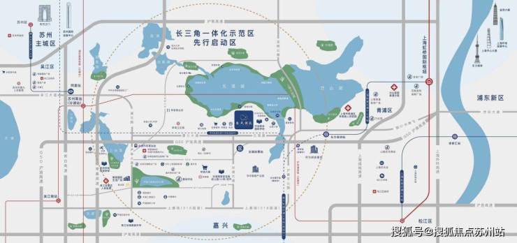 全维交通,沪苏嘉三城交汇 高速:项目靠近G50沪渝高速汾湖收费站,车行40分钟可直达上海虹桥,1.5小时直达杭州。 公交:可乘坐示范区1号线到达上海地铁17号线东方绿舟站。 高铁:苏州南站(汾湖站)在建中,经沪苏湖高铁、通苏嘉甬高铁,8分钟可到松江,20分钟到达上海虹桥。 地铁:上海地铁17号线西延线(在建中)、苏州地铁10号线(规划中)、嘉兴地铁3号线(规划中),将在水乡客厅站交汇。