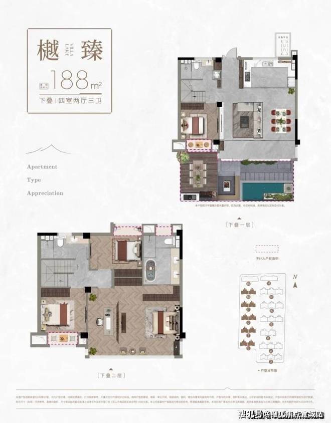 (3#5#7#9#11#13#小叠)中下叠建面:188平,四房两厅三卫(下叠送南向花园35平,中叠送北向花园15平)
