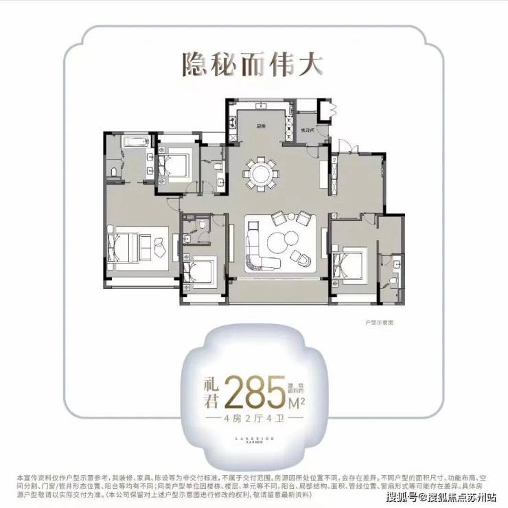 主力户型:建面约285㎡四房,全系大平层设计,得房率83-85%,5-6开间朝南,部分户型拥有270°环幕瞰湖视野