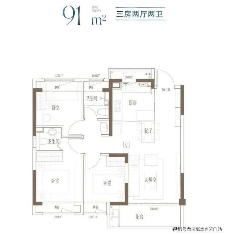 建面约91㎡3房2厅2卫▼