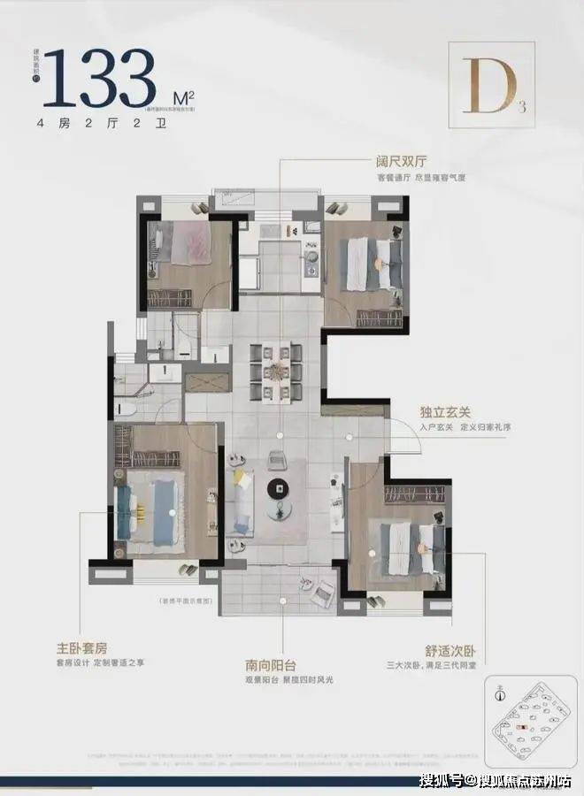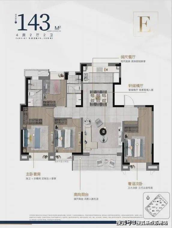 建筑面积约133㎡/143㎡四房两厅两卫,大开间,在满足空间感的基础上,增加户型的功能性,承载生活高舒适度;其中建筑面积约133㎡的四叶草户型,主卧套房设计,三代同堂各有私密天地;南向观景阳台,饱览阳光美景,双卫设计,提供更多私密空间与生活便利。