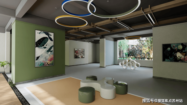 特色架空层:创造性地打通建筑一层,构建架空层。以“自然/流动/公众/情感/品位”为核心概念元素,串联儿童区、健身区、休闲区等多元功能区,打造全龄娱乐休闲生活空间。