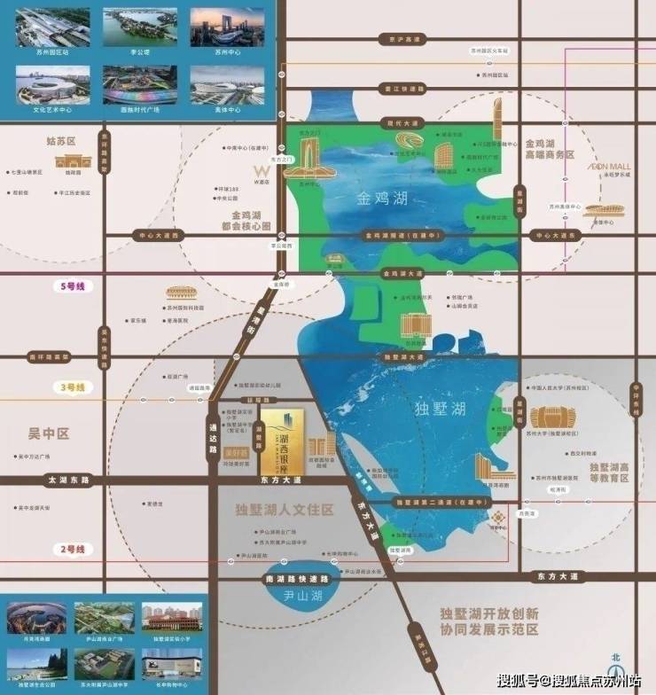 高端生活圈:双湖交汇处,尽享城芯繁华。4公里范围左右,汇聚了李公堤、金鸡湖高尔夫俱乐部、凯宾斯基大酒店、月亮湾国际中心等高端商业/生态配套。东方之门、苏州中心、W酒店、摩天轮游乐场等苏州地标级商业,均在视野范围之内,尽览双湖繁华。