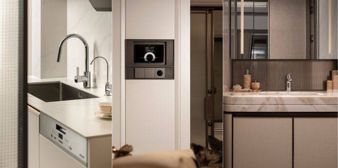 卫浴空间配备唯宝智能卫浴与高仪花洒系统,带来星级酒店般的舒适体验;厨房区域则搭载美诺4件套(燃气灶具、吸油烟机、烤箱、洗碗机)、博世冰箱等。同时,户型还引入华为全屋智能系统,实现家居生活的便捷操控;霍尼韦尔新风系统、日立/东芝空调地暖三大件也全部配齐,全方位保障居住的健康与舒适。
