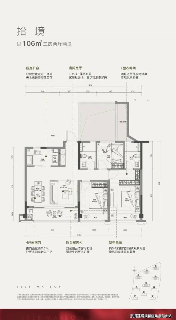 户型打造LDKG一体化布局,南向4开间尺度,面宽约11.7米,让更多阳光照射室内,搭配约5.4米宽南向封闭式观景阳台,设置有大尺度厨房空间,可以轻松放置双开门冰箱,U型厨房空间,操作台面更大,可以同时满足更多人烹饪美食!