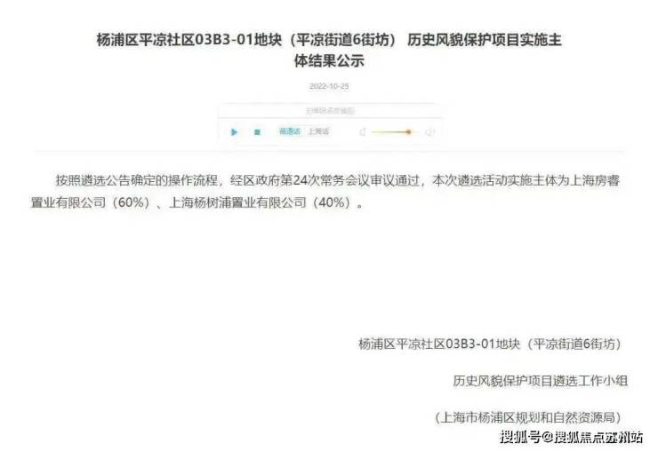 2022年10月25日,杨浦区人民政府官网发布公告,杨浦区平凉社区03B3-01地块(平凉街道6街坊)历史风貌保护项目实施主体结果公示:“本次遴选活动实施主体为上海房睿职业有限公司(60%)、上海杨树浦置业有限公司(40%)。”
