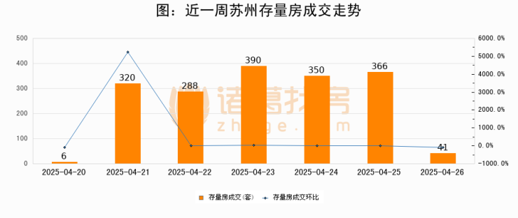 从存量房来看,2025年04月26日苏州存量房单日成交41套,比昨日减少325套,环比下降88.8%。从近一周存量房成交来看,苏州存量房日均成交套数为251套,04月26日单日成交41套,低于近一周平均水平83.7%。