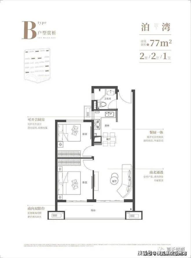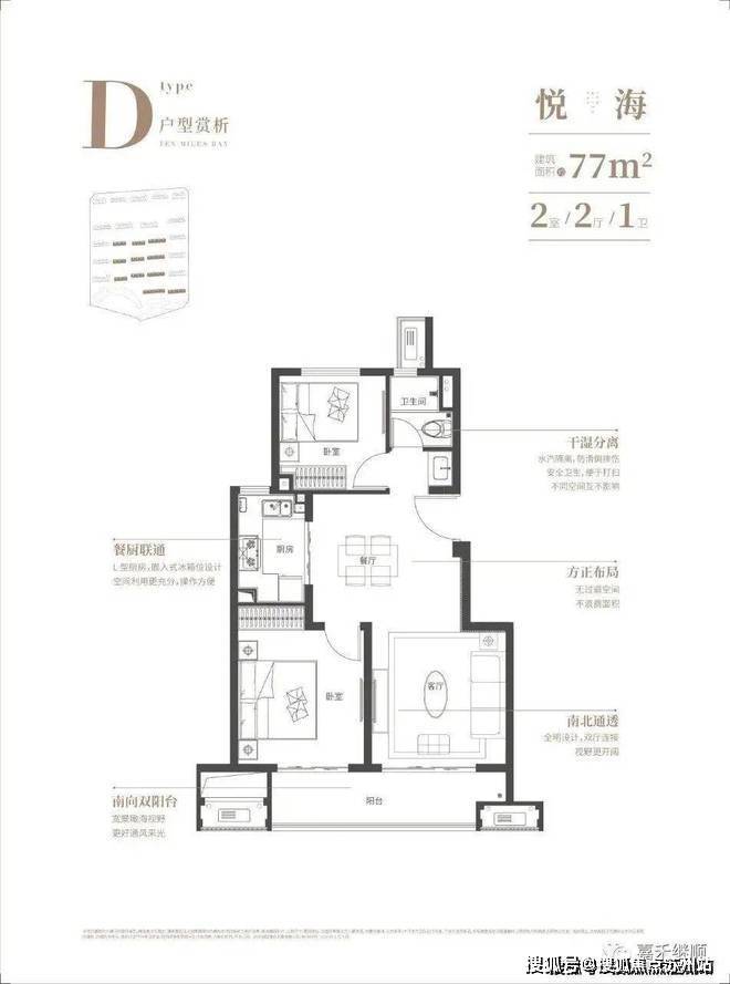 【高层77平】6.7m大面宽双阳台,180º东西向全境观海,户型方正,南北通透!