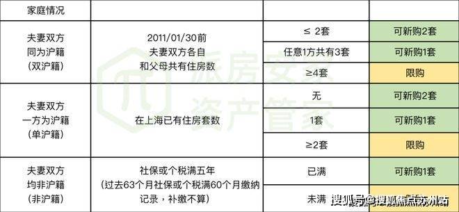 非上海户籍家庭,一方社保或者个税满5年,可购买一套。满5年社保或满5年个税是指签合同当月,往前推算63个月社保或个税正常缴纳满60个月。