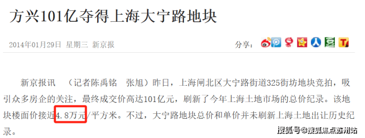 2014年1月土拍,上海闸北大宁地块出让,最终被金茂拿下,楼板价接近4.8万一平,甚至超越了周边的二手房价。