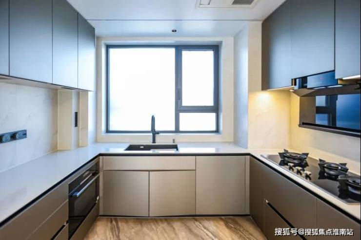 厨房为U型布局,配备博世四件套厨电,包含三眼灶、油烟机、洗碗机、蒸烤一体机,还有科勒抽拉龙头及日立厨房空调等高端品牌,中岛与飘窗休闲区相连,扩展了操作与互动场景.