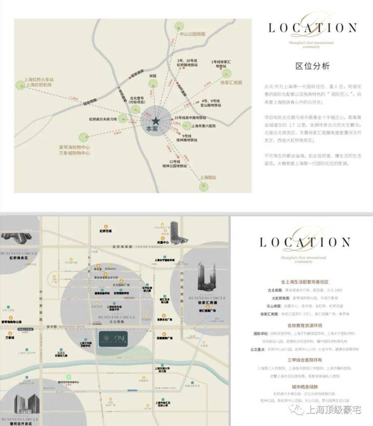 一、区位和交通:1.1、我们地处闵行长宁交界的古北板块,项目依托虹桥交通枢纽和长宁徐汇商圈,交通便利配套成熟,是上海第一个大型高标准的国际豪宅社区。
