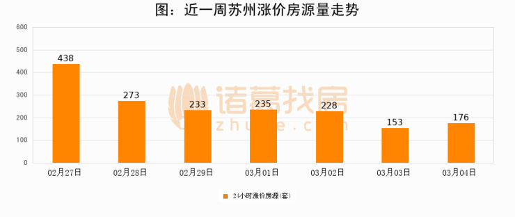 根据诸葛找房数据显示,苏州24小时涨价房源量为176套,较03月03日增加23套,环比上涨15%。与此同时,涨价房源占比小幅扩大,业主信心有所提升。