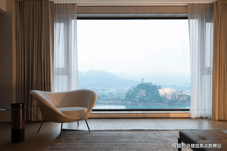山峰在晨曦的朦胧中,轮廓若隐若现,让人无法抗拒它的美丽。而室内简约的设计风格,与窗外的美景相得益彰,让人无法抗拒这样的组合。