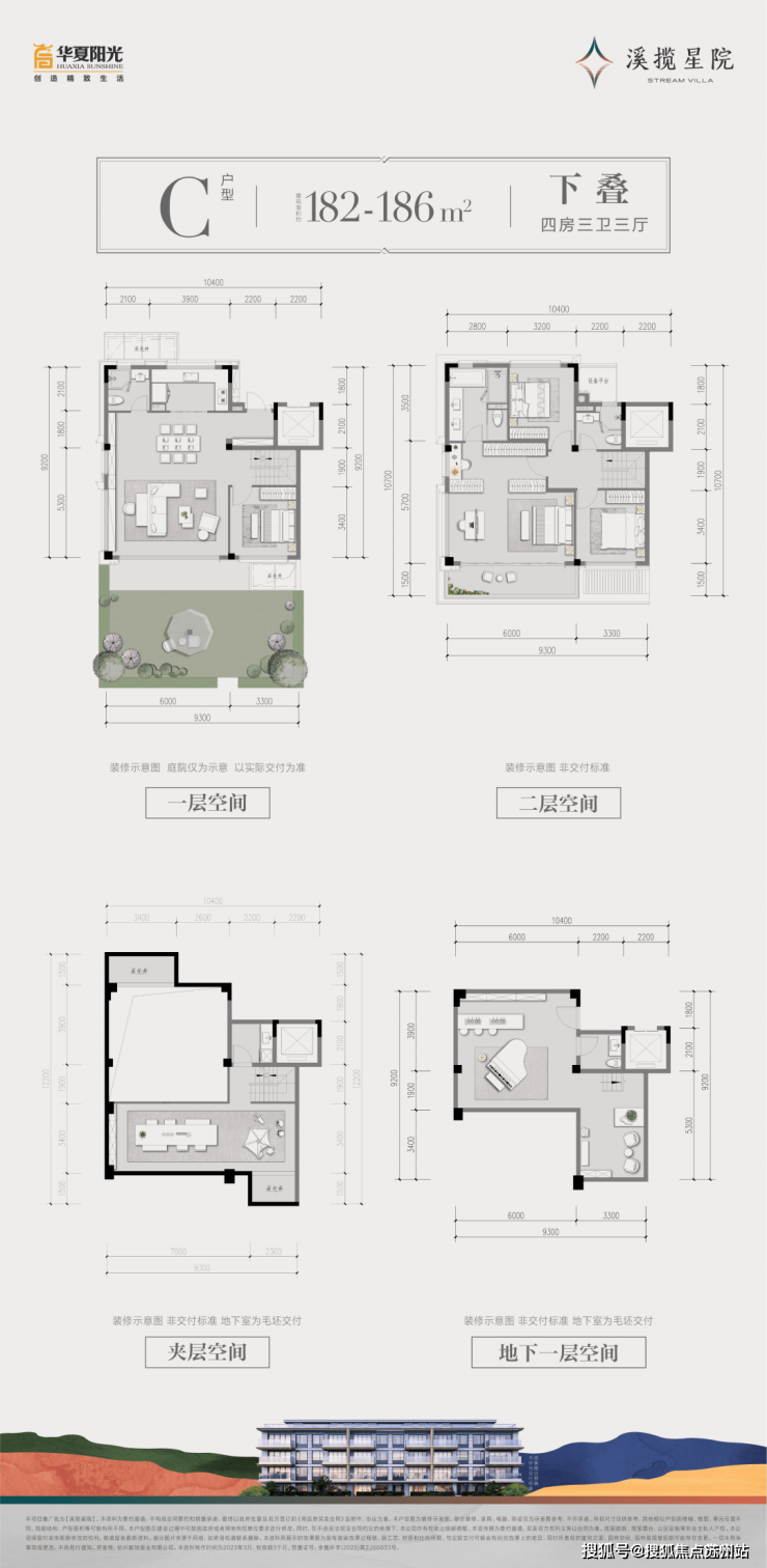 建面约182~186㎡下叠:多功能地下室/约6m瞰景阳台/豪华主卧套房/父母阳光房
