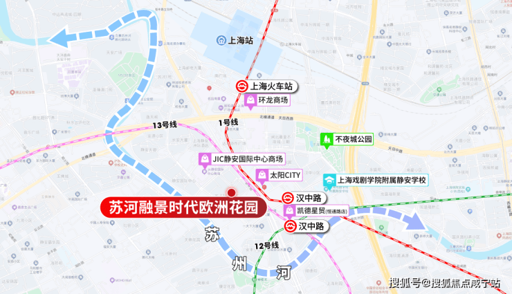 苏河融景整个小区由汉中路、长安路、普济路与恒丰路围合,临近汉中路地铁站和苏州河滨河景观带。苏河融景整个小区分2期开发,其中1号2号一期开发,其余楼栋二期开发。