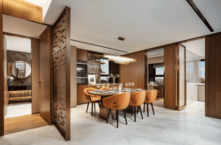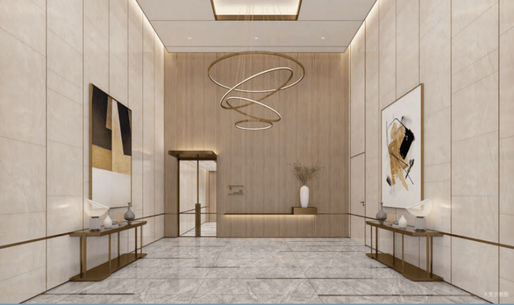 地上地下双重入户大堂,甄选大理石墙面、亚克力灯等,营造堪比五星级酒店的尊崇体验.地上入户大堂空间宽敞、精致气派,地下入户大堂温馨尊容,归家、迎客风范独具.