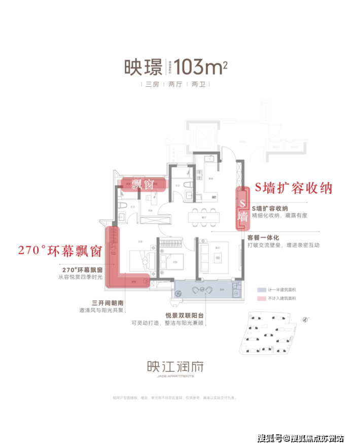 边套103㎡户型引入了一般豪宅才能够拥有的270°环幕飘窗设计,保留S墙的创新,给厨房预留更大的操作空间。客餐厅一体化,双联阳台+多飘窗赠送,让空间不只有舒适度,拥有更多灵动空间,可以说是非常令人心动的户型了。当然,在价位上较中间套也是略贵一些。