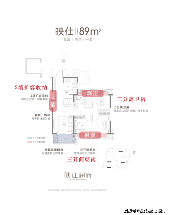 建面约89㎡小户,打造以创新S墙为代表的收纳系统,完美解决小户型的收纳问题。主卧、主卫、次卧多飘窗设计,用更多的灵动空间,解锁了生活的不同场景,还打造了媲美双卫的三分离卫浴,实现的是不输双卫的居住体验,谁看不说绝!