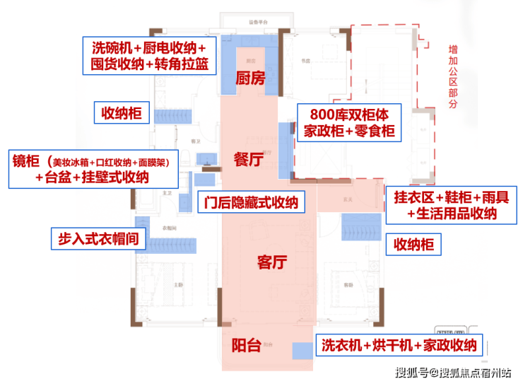 1、精细化收纳系统: 全场景收纳,卫生间镜柜内含美妆冰箱、房门后有家政收纳空间、厨房的小家电区、衣帽柜收纳等等,这些一起解决了家庭的大部分收纳问题。