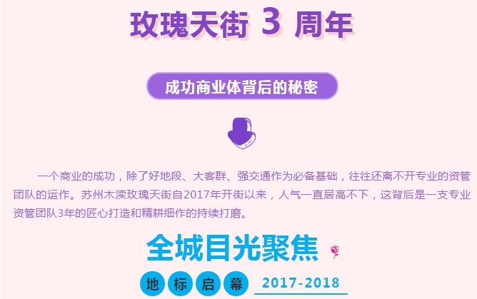 三年来,苏州木渎玫瑰天街本着服务好每一位业主的宗旨,自始至终灌之以匠心、恒心,全心全意为广大业主服务,客流量同比增长58%,营业额同比上升46%,取得了有目共睹的优异成绩。玫瑰天街凭借自身品牌优势和地缘优势,举办了大量提升入驻品牌活跃度,拉动周边地区消费的品牌活动。随着入驻的品牌越来越多,周边消费需求越来越多元化,玫瑰天街将继续集中优化天街优势,打造多层次、全方位的品牌系列主题活动,满足业主和市场的需求。