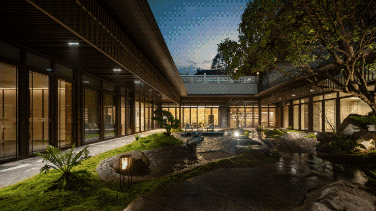 粉墙黛瓦与飞檐戗角的纯正风骨之下,是现代精工的加持,充满东方风骨的外立面经得起细细端详。