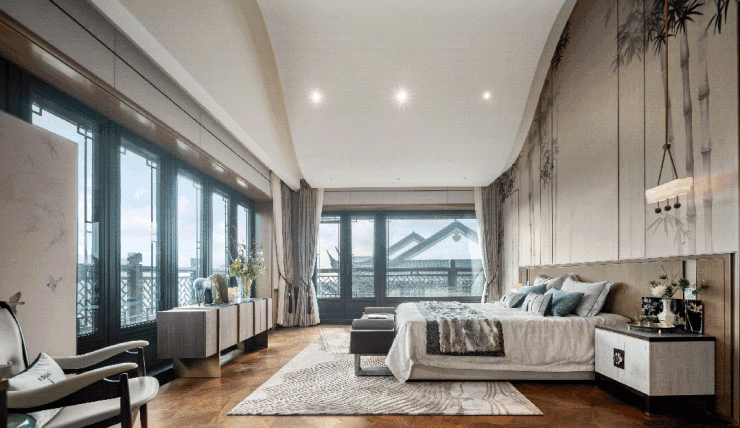 大面积的落地玻璃打破传统中式建筑的采光局限,像一个宽阔的取景框,把清风与自然光线毫无保留地请进屋里 ,置身其中,身心得以舒展。